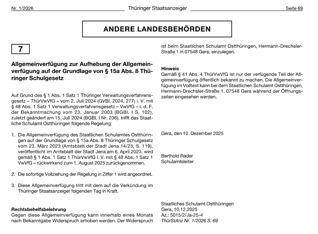 Im Auftrag des Staatlichen Schulamtes Ostthüringen veröffentlichen wir hier die Aufhebung der Allgemeinverfügung im Rahmen des Schulaufnahmeverfahrens Klasse 1, veröffentlicht im Thüringer Staatsanzeiger.